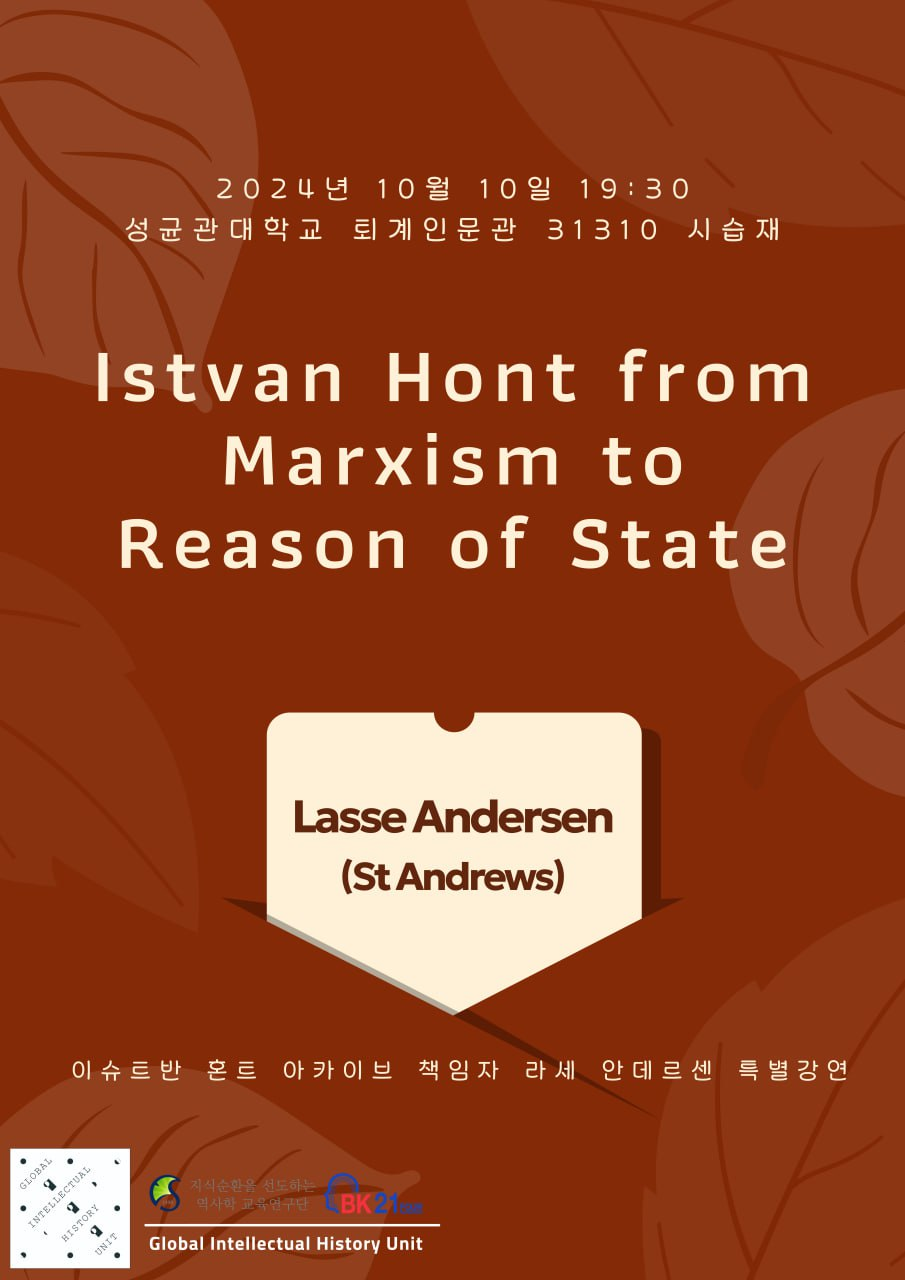아래 내용은 2024년 10월 10일 성균관대학교 사학과 GIHU(Global Intellectual History Unit)에서 주최한 "이슈트반 혼트: 마르크스주의에서 국가 이성으로"(István Hont from Marxism to Reason of State) 강연 및 질의답변의 내용을 요약하고 정리한 것이다. 강연자 라세 안데르센(Lasse Andersen)은 세인트앤드루스대학 지성사연구소에서 이슈트반 혼트 문서고 등의 구축 작업을 담당해왔으며, 현재 세인트앤드루스대학 사학과 대학원에서 19세기 영국 토지개혁논쟁에 관한 박사학위논문을 마무리하고 있다. 그가 작업한 혼트 문서고 소장원고 중 일부는 온라인으로 공개되어 있고, 차후 그의 편집 하에 혼트 미출간 논문집이 발간될 예정이다.